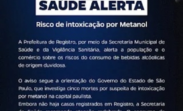 A Secretaria Municipal de Saúde e a Vigilância Sanitária de Registro-SP reforçam os riscos do consumo de bebidas alcoólicas de origem duvidosa, após casos de suspeita de intoxicação por metanol registrados na capital paulista.Embora não haja casos registrados em Registro, a secretaria recomenda atenção redobrada.