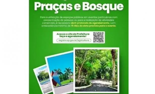 A Prefeitura de Registro-SP orienta que, para a utilização de praças e bosques do município em eventos particulares com concentração de pessoas ou para a realização de atividades comerciais, é necessário realizar o protocolo de agendamento com antecedência mínima de 15 dias da data prevista para o evento. O procedimento deve ser feito por meio do site oficial da Prefeitura. registro.sp.gov.br/agricultura Planeje seu evento com antecedência e utilize os espaços públicos de forma organizada e regularizada.